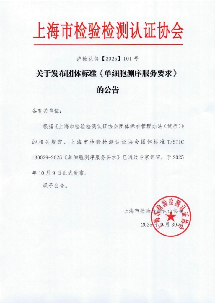2025年10月11日,团体标准《单细胞测序服务要求》(T/STIC130029-2024)发布并实施,该文件由上海市检验检测认证协会提出并归口。本标准是国内首个单细胞测序领域的服务类标准。