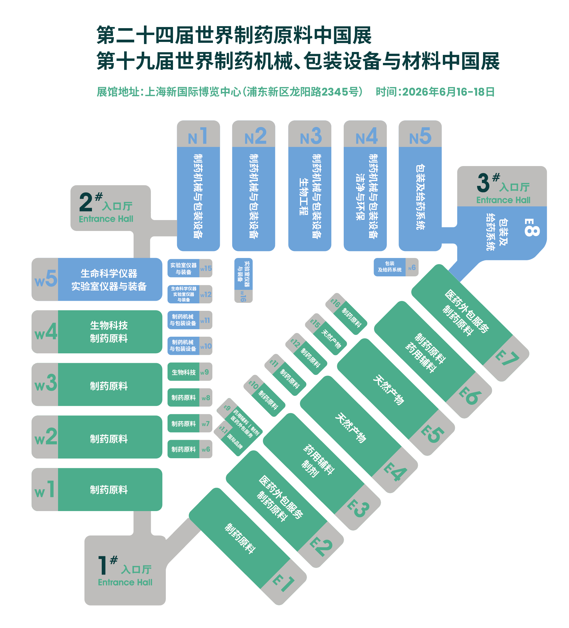 W1 – W4、W6 – W8、E1 – E2、E6 – E7、E10 – E12、E16馆: 制药原料